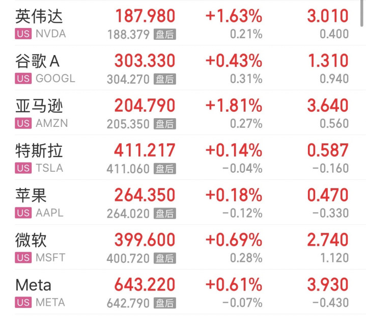 大型科技股普涨,英伟达、亚马逊涨超1%,苹果、特斯拉、Meta、微软小幅上涨。