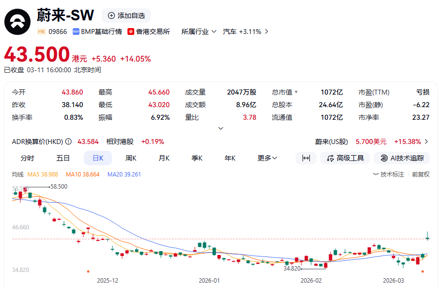 3月11日,蔚来的港股——蔚来-SW股价大涨14.05%,使其股价年内累计上涨6.2%,蔚来由此成为港股市场年内股价表现最佳的整车上市企业之一,其总市值也重返1000亿港元之上。